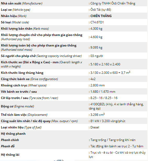 Previous Next Toggle navigation Giới thiệu Tầm nhìn doanh nghiệp Sứ mệnh và giá trị cốt lõi Văn Hóa Doanh Nghiệp Chiến Lược Con Người Chiến Lược Phát Triển Công ty thành viên CÔNG TY TNHH TRUNG SƠN SHOWROOM MÁY MÓC THIẾT BỊ TRUNG SƠN CÔNG TY TNHH TRUNG SON - VĨNH LINH CÔNG TY TNHH TRUNG SON - GIO LINH CÔNG TY TNHH TRUNG SƠN - ĐÔNG HÀ CÔNG TY TNHH TRUNG SƠN - HƯỚNG HÓA TRUNG SƠN HUẾ TRUNG SƠN QUẢNG BÌNH TRUNG TÂM THƯƠNG MẠI Ô TÔ TRUNG SƠN ĐÀ NẴNG Lĩnh vựu hoạt động Sản Phẩm Phân Phối Dịch Vụ Sữa Chữa Dịch Vụ Bảo Hành Dịch Vụ Cho Thuê Máy Móc Tin tức sự kiện Thư viện hỉnh ảnh công ty video clip nổi bật Tuyển dụng Liện hệ Tin nổi bật: Lái thử ô tô Suzuki tại thành phố Đông Hà, Tỉnh Quảng Trị | “Doanh nghiệp lỗ gấp 3 lần vốn vẫn bị áp thuế thu nhập” Danh mục sản phẩm Máy Nông nghiệp Máy cơ khí Trung sơn Quảng Trị Trung Sơn Quảng Bình Trung sơn Đà Nẵng Trung sơn huế Ô tô Toyota Ô tô Hoa Mai Ô tô tải chiến thắng Bán tải và SUV Isuzu Ô tô tải Isuzu Máy móc thiết bị Thiết Bị Cầm Tay MAKITA Thiết Bị Cầm Tay BOSCH ĐỘNG CƠ HONDA Máy xây dựng Sản phẩm bán chạy ÔTÔ TẢI (CÓ MUI) - DONGFENG CT9.0TL1/KM - 9.000 KG Máy trộn bê tông Rồng Việt -250L Máy cày xới đất cầm tay GN91 Máy phun bê tông HSP7 Máy nén khí D&D RBC2050I (2HP) MÁY BĂM NỀN KL – 205E Hỗ trợ trực tuyến Khu vực HCM - Toàn quốc Lĩnh vực nông ngư cơ Mr Sơn : 0986325999 Ms Linh : 0988166272 Lĩnh vực ô tô Ms Linh : 0941605999 Ms Nhung : 0931937999 ÔTÔ TẢI (TỰ ĐỔ) - CHIẾN THẮNG CT4.6TD1 - 4.600 KG Mã sản phẩm : ct46td1 Giá bán: Liên Hệ Giới thiệu sản phẩm Thông số kỹ thuật Đối tác của chúng tôi Kết nối cộng đồng Đăng ký nhận bản tin Đăng ký
