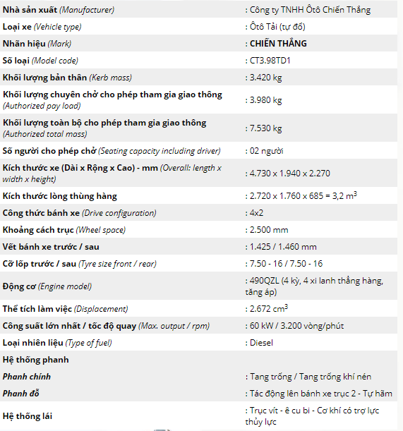 Previous Next Toggle navigation Giới thiệu Tầm nhìn doanh nghiệp Sứ mệnh và giá trị cốt lõi Văn Hóa Doanh Nghiệp Chiến Lược Con Người Chiến Lược Phát Triển Công ty thành viên CÔNG TY TNHH TRUNG SƠN SHOWROOM MÁY MÓC THIẾT BỊ TRUNG SƠN CÔNG TY TNHH TRUNG SON - VĨNH LINH CÔNG TY TNHH TRUNG SON - GIO LINH CÔNG TY TNHH TRUNG SƠN - ĐÔNG HÀ CÔNG TY TNHH TRUNG SƠN - HƯỚNG HÓA TRUNG SƠN HUẾ TRUNG SƠN QUẢNG BÌNH TRUNG TÂM THƯƠNG MẠI Ô TÔ TRUNG SƠN ĐÀ NẴNG Lĩnh vựu hoạt động Sản Phẩm Phân Phối Dịch Vụ Sữa Chữa Dịch Vụ Bảo Hành Dịch Vụ Cho Thuê Máy Móc Tin tức sự kiện Thư viện hỉnh ảnh công ty video clip nổi bật Tuyển dụng Liện hệ Tin nổi bật: Lái thử ô tô Suzuki tại thành phố Đông Hà, Tỉnh Quảng Trị | “Doanh nghiệp lỗ gấp 3 lần vốn vẫn bị áp thuế thu nhập” Danh mục sản phẩm Máy Nông nghiệp Máy cơ khí Trung sơn Quảng Trị Trung Sơn Quảng Bình Trung sơn Đà Nẵng Trung sơn huế Ô tô Toyota Ô tô Hoa Mai Ô tô tải chiến thắng Bán tải và SUV Isuzu Ô tô tải Isuzu Máy móc thiết bị Thiết Bị Cầm Tay MAKITA Thiết Bị Cầm Tay BOSCH ĐỘNG CƠ HONDA Máy xây dựng Sản phẩm bán chạy ÔTÔ TẢI (CÓ MUI) - DONGFENG CT9.0TL1/KM - 9.000 KG Máy trộn bê tông Rồng Việt -250L Máy cày xới đất cầm tay GN91 Máy phun bê tông HSP7 Máy nén khí D&D RBC2050I (2HP) MÁY BĂM NỀN KL – 205E Hỗ trợ trực tuyến Khu vực HCM - Toàn quốc Lĩnh vực nông ngư cơ Mr Sơn : 0986325999 Ms Linh : 0988166272 Lĩnh vực ô tô Ms Linh : 0941605999 Ms Nhung : 0931937999 ÔTÔ TẢI (TỰ ĐỔ) - CHIẾN THẮNG CT3.98TD1 - 3.980 KG Mã sản phẩm : CT398TD1 Giá bán: Liên Hệ Giới thiệu sản phẩm Thông số kỹ thuật Đối tác của chúng tôi Kết nối cộng đồng Đăng ký nhận bản tin Đăng ký
